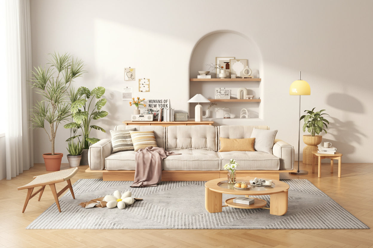 Canapé beige avec cadre en bois